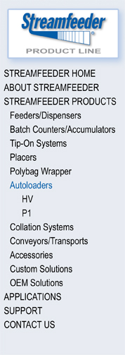 Streamfeeder AutoStream Series High-Capacity Auto Loaders are designed to be superior quality, flexible "bulk product" feeding solutions. Streamfeeder AutoStream loaders easily integrate to a variety of host equipment including high-speed batch counting, addressing bases, swing arm inserter hopper stations, rotary drum feeders, and much more.
