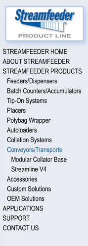 Our Streamfeeder Conveyors and Transports are designed to be flexible solutions for packaging operations pursuing greater productivity through automation. Ideal for sheets, forms, and much more with Streamfeeder Wrapping Systems, Streamfeeder Cartoners, Streamfeeder L-Sealers, Streamfeeder tip-on systems and many other types of packaging equipment that require dependable automation for product counting and accumulating.