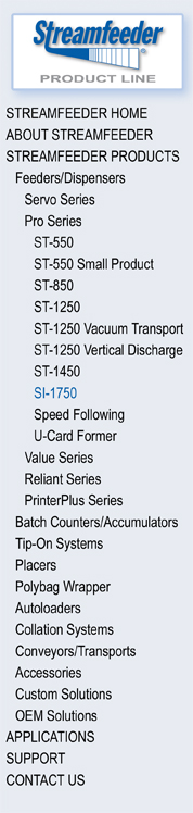 The Streamfeeder SI-1750 is designed to be a flexible feeding solution for packaging operations pursuing greater productivity through automation. Ideal for use with Wrapper, Cartoner, L-Sealer Infeed Conveyors, and other types of packaging equipment that require high performance feeding automation. The powerful Streamfeeder I-Quipped™ controller features an embedded microprocessor which provides an Information Management System and Host Communication.