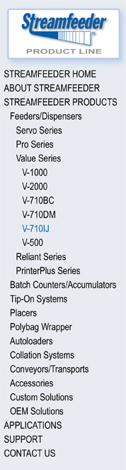 The Streamfeeder V-710IJ is for production mailing operations that demand maximum throughput from their Ink Jet Printing, Labeling, and Tabbing Bases. The lightweight Streamfeeder V-710IJ provides superior feeding to precisely separate and singulate many types and sizes of product. Job setups and changeovers are easily and quickly accomplished. The variable speed, clutch-free motor provides dependable feeding performance.